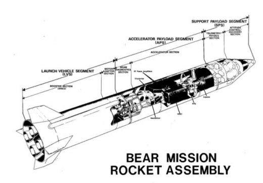 On July 13, 1989 the Beam Experiment Aboard Rocket (BEAR) linear accelerator was successfully launched and operated in space by Los Alamos National Laborotory. The rocket trajectory was sub-orbital, reaching altitude of 220 km. The flight demonstrated that a neutral hydrogen beam could be successfully propagated in an exoatmospheric environment. The cross-section of the rocket is shown in figure 4.