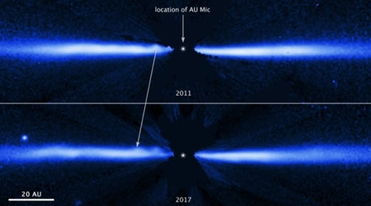 Image: These two NASA Hubble Space Telescope images, taken six years apart, show fast-moving blobs of material sweeping outwardly through a debris disk around the young, nearby red dwarf star AU Microscopii (AU Mic). The top image was taken in 2011; the bottom in 2017. Hubble’s Space Telescope Imaging Spectrograph (STIS) took the images in visible light. This comparison of the two images shows the six-year movement of one of the known blobs (marked by an arrow). Credit: NASA, ESA, J. Wisniewski (University of Oklahoma), C. Grady (Eureka Scientific), and G. Schneider (Steward Observatory).