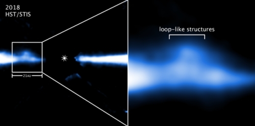 Image: The box in the image at left highlights one blob of material extending above and below the disk. Hubble’s Space Telescope Imaging Spectrograph (STIS) took the picture in 2018, in visible light. The glare of the star, located at the center of the disk, has been blocked out by the STIS coronagraph so that astronomers can see more structure in the disk. The STIS close-up image at right reveals, for the first time, details in the blobby material, including a loop-like structure and a mushroom-shaped cap. Astronomers expect the train of blobs to clear out the disk within only 1.5 million years. The consequences are that any rocky planets could be left bone-dry and lifeless, because comets and asteroids will no longer be available to glaze the planets with water or organic compounds. Credit: NASA, ESA, J. Wisniewski (University of Oklahoma), C. Grady (Eureka Scientific), and G. Schneider (Steward Observatory).