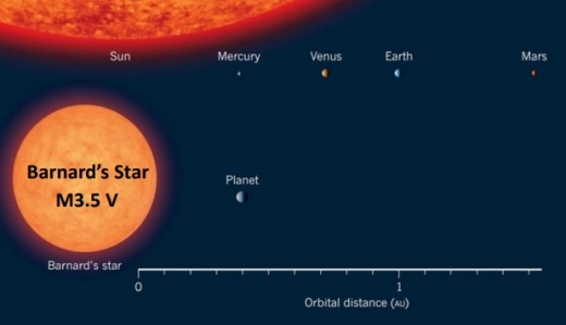 Image: Model of the Barnard’s Star planet system (from Ribas et al. 2018) compared to the inner Solar System. Barnard b orbits at 0..404 AU from its M3.5V host star and has an equilibrium temperature of T=-168C° in its 233-day orbit. Credit: Edward Guinan, Scott Engle / Villanova University.