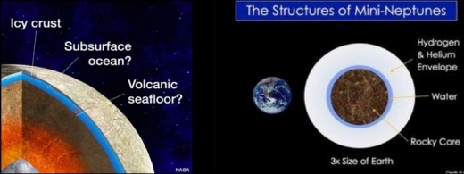Image: (L) Possible model of Barnard b based on geothermal heating. If water is present, geothermal heating could create a subsurface ocean where primitive life could exist. The model would be a scaled-up Europa. (R) In another scenario if the mass of the exoplanet is > 7 M⊕, then the stronger gravity could cause the retention of its primordial H2/He atmosphere. These planets are known as Mini-Neptunes / Dwarf Gas Giants. Credit: Edward Guinan, Scott Engle / Villanova University.