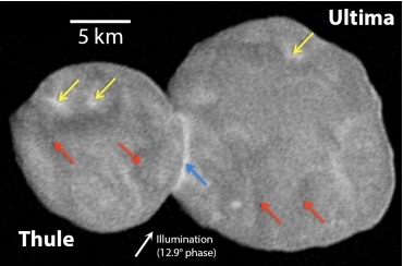 Image: This is Figure 1 from Stern’s abstract. Caption: Ultima Thule as seen by the LORRI imager in the close approach CA04 observation (140 m/pixel), including relatively bright circular patches a few km wide (yellow arrows), darker regions up to several km wide (red arrows), a bright, cylindrically symmetric neck (blue arrow), and quasi-linear and arcuate bright features; note also the mottled appearance. Credit: JHU/APL; Alan Stern.