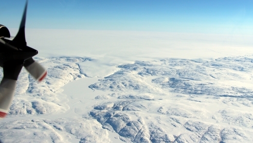 Image: The Hiawatha impact crater is covered by the Greenland Ice Sheet, which flows just beyond the crater rim, forming a semi-circular edge. Part of this edge (top of photo) and a tongue of ice that breaches the crater’s rim are shown in this photo taken during a NASA Operation IceBridge flight on April 17. Credit: NASA/John Sonntag.