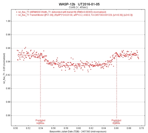 Image: The light curve shown here records the dimming of the exoplanet WASP-12b, taken Jan. 5, 2016, by Dennis Conti, Ph.D., founder and chair of the AAVSO’s Exoplanet Section. Conti used equipment available to amateur astronomers and compared his results to published data to show that he was able to successfully and accurately detect the exoplanet. The AAVSO’s Exoplanet Database will provide a place for amateur astronomers following established procedures to make their exoplanet transit observations available to the broader community of researchers, and to have their data archived long-term. Credit: Dennis Conti.
