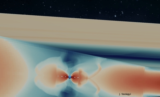 Image: One of the computer simulations on the formation of moons (white bodies) around Neptune (blue sphere). Credit: Judit Szulágyi.