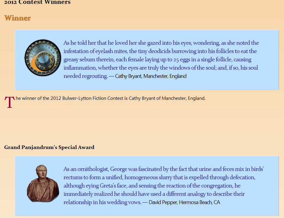 The 2012 winners of the worst opening sentance of any novel has just been announced by The Bulwer-Lytton Fiction Contest