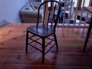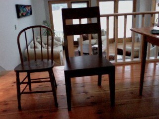 When we moved into our first house eleven years ago, my dad gave Peter and me a set of chairs he'd bought for a great deal from an old camp that was closing. They were very sweet (like my dad) and we were happy to have them. I'm not sure how old they already were, but they were full of surprises that only camp chairs can provide. For example, while moving them around one day, I discovered that all of them had wads of old gum stuck under the seat. One night, a guest leaned back and the spindles on the back split (sorry Pete!). On hot days, guests would not only STICK to the chair but the stain or whatever is on them would actually melt and turn white. And also stain the person's clothes. (Sorry Marvin! Sorry Libba!)