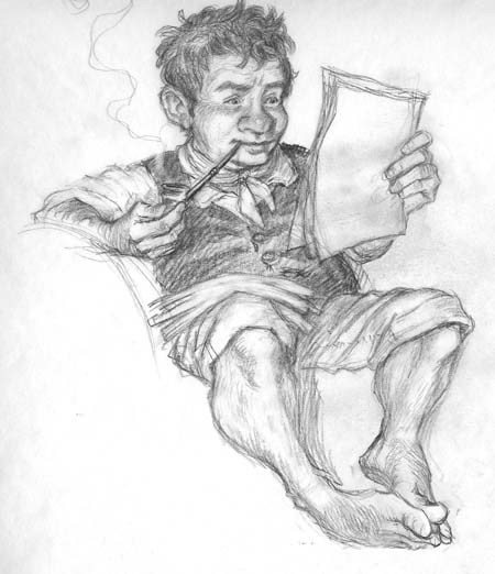 After the sketch was approved, I donned my fanciest hobbit-made attire and struck a quick pose. As with any photographic reference, no one photo captures all the elements you need, and so several photos were utilized to create a final sketch of Mr. Baggins.
