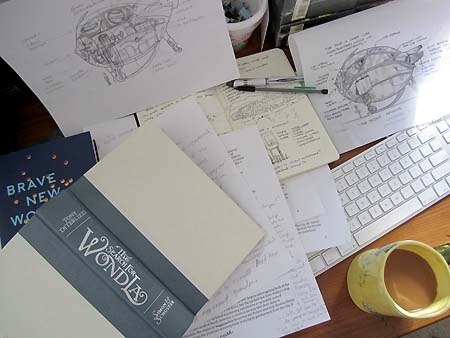 Of interest in the above photo are the detailed drawings of Hailey's ship where many scenes take place. Though the airship is obviously a product of my imagination, I used a combination of traditional boat and airplane terms to describe it. Also, you'll see an open Moleskine notebook which I've carried with me for the better part of a year. It is full of notes, notions and drawings on what I hope to incorporate in books 2 & 3. (There's even a cover sketch in it!)