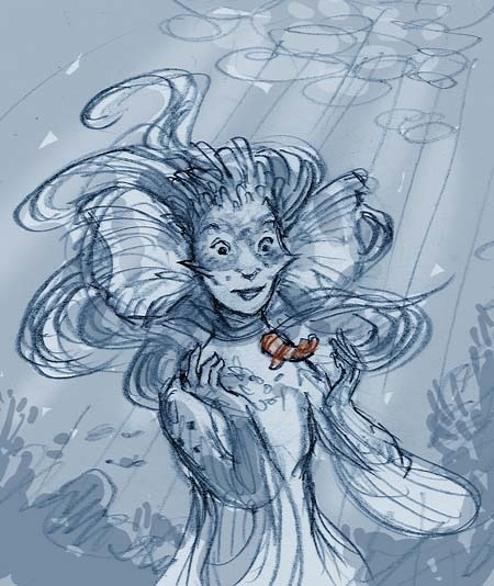 For those who read the books, this is the mermaid with the fish from Laurie's aquarium. By the way, this pose and composition mimic the cover to book 3 of the original series (you know, the one with Simon receiving the fairy fruit). There was a tentative book titled scribbled underneath the sketch, The Mermaid's Gift. I might have to find a new story for that title, I rather like it…