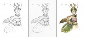 The sketches were traced onto Strathmore smooth Bristol using a light table. From there, reference was gathered (with help from my little 5-year old sprite) from the outdoors and from my bookshelf.