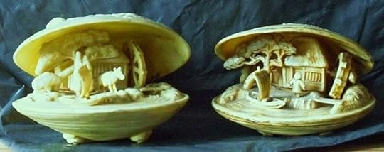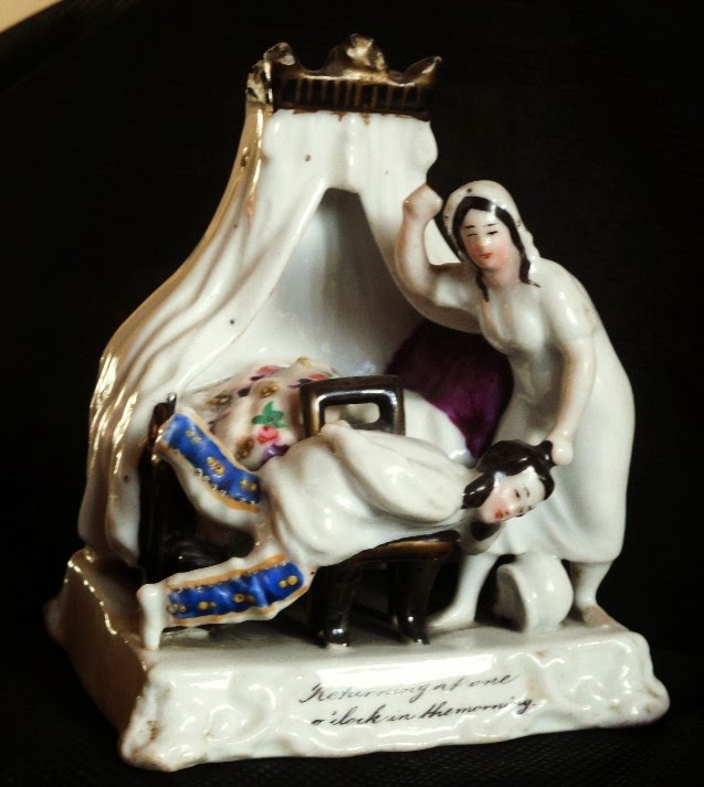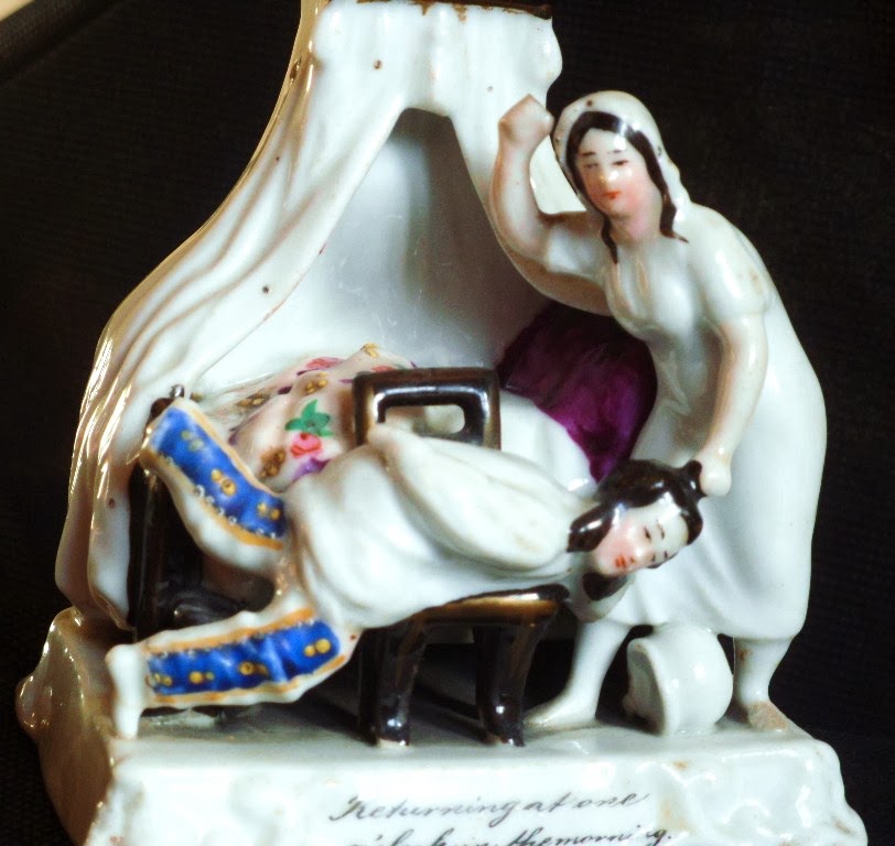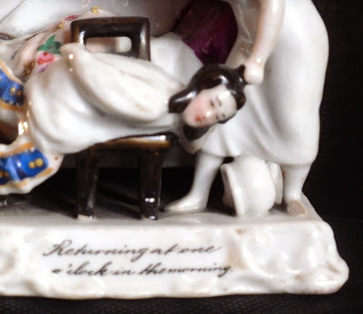Since PC didn't exist in my childhood, I hardly noticed that it showed a scene of domestic violence - something unknown in my immediate family. I thought it was funny. The little wife was beating her little husband because he'd come home at one in the morning! And the weaker woman was beating the stronger man - hilarious! (As a child, I'm glad to be able to say, I found newspaper accounts of husbands beating wives (or vice-versa) and parents beating children, flatly unbelievable - as unbelievable as pigs flying. It was simply outside my experience. This little ornament seemed quaint, as one showing a horse riding a man might, or a mouse chasing a cat.)