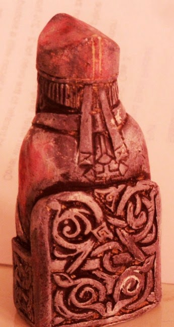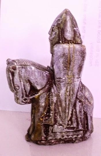 I imagine most, if not all, of my readers will immediately recognise him - even without the caption - as a knight from the Lewis chessmen. The photograph above, though, was taken by me of one that sits on my shelf. It's a replica, quite a good one, I think, and it allows you to hold the little character in your hand and get a good close look at him.