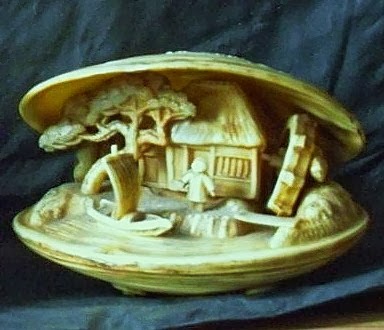 Shell, seen from above, showing the dragon Here's yet another of my mother's old ornaments. There are two of them, as a matter of fact. My Grandmother Price bought one for her daughter, and one for her daughter-in-law, my mother. My mother liked 'the shells' much more than my aunt. When my aunt grew tired of her shell, she gave it to my mother. They are 'Woolworth's Specials', made of plastic. I loved them. I loved peering in at the little house, with its water-wheel, and the rather blobby person who is watching the boat sail by. I liked to speculate on what would happen when the shell closed.