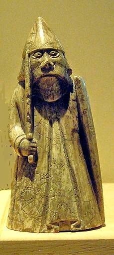 So, what is known about the pieces? Well, most of them are carved from walrus ivory, though a few are made from whales' teeth. Their manufacture has been dated pretty firmly to the 12th Century, in Norway, probably in Trondheim, where there was a market for such expensive, high-status articles, and where similar figures have been found. Dr. Alex Woolf, director of the Institute for Medieval Studies of the University of St. Andrews, argues that the armour worn by some of the figures is a perfect replica of that worn in Norway at the time.