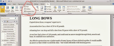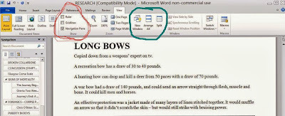 When I'm writing, and want to check something in my research file, I open another window, and open the research file in that, which means clicking from one to the other. But I could have both files visible on the same screen, with a split screen. If you go to the 'View' menu in Word, it offers you a choice of 'Open New Window' - which means you can open a new window from inside the file you're working on. (Circled in green.)