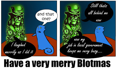 One reason for Blott's absence is that he badly cut his paw on a very sharp chisel while doing a bit of wood-carving. But he's handling the pen again now.