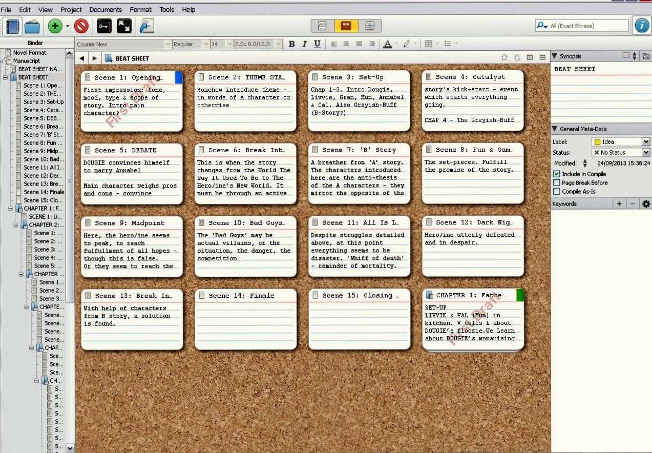 Roz Morris Trouble is, these methods require lots of fiddly index cards, or big sheets of paper, and space to spread them out - space I don't really have. Was there some tighter - almost, you might say, virtual - way of doing it? And I remembered that Scrivener offers a free 30 day trial.