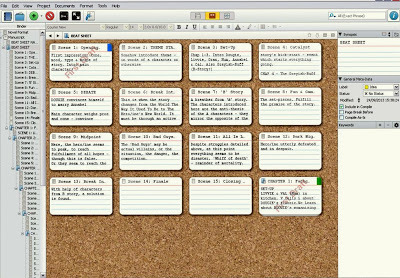 But sometimes you get befuddled by all those words. You want to see the story simply laid out in front of you. At those times you click on Corkboard, and this shows you your 'index cards' notes from the right-hand pane - but shows you them all together. Like this. (You can change the size of the cards, and how many appear in a row.)