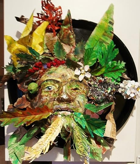 Good Yule! Happy Solstice! This blog won’t be up again before Christmas, so this seems a good time to wish you all a happy mid-winter gathering and feast, call it what you will. As you can see, the Green Man has now made himself - or should that be Himself? - known. I wasn't going to give him eyes - I started off thinking that he should just be a mask - but then eyes seemed important. And then just one eye. Which makes it clear who He is - an appropriate visitor for this time of year, given all the drinking, and not just Mead of Poetry. There's much more I can do... I'm thinking of trying something like this,for his crown...