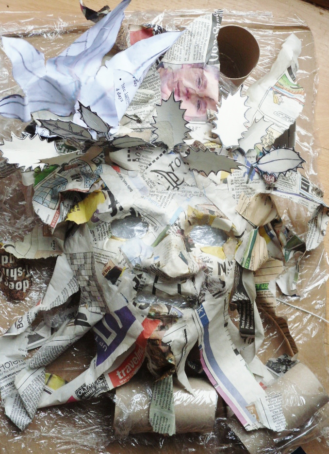 A cheap plastic mask of tragedy, which I coated with vaseline. After lots of paste and torn paper, it turned into this -