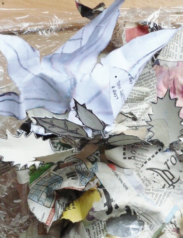 This detail of the top left hand corner shows the cardboard holly leaves, and a crumpled paper sycamore leaf,