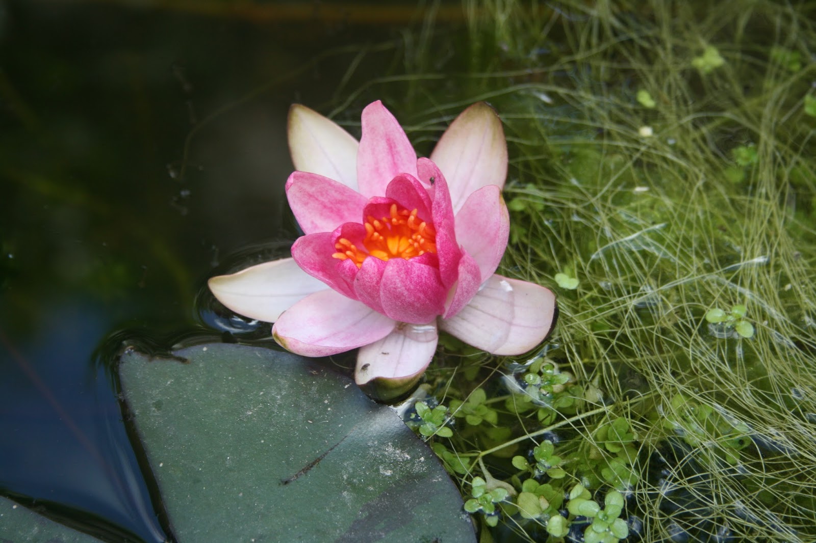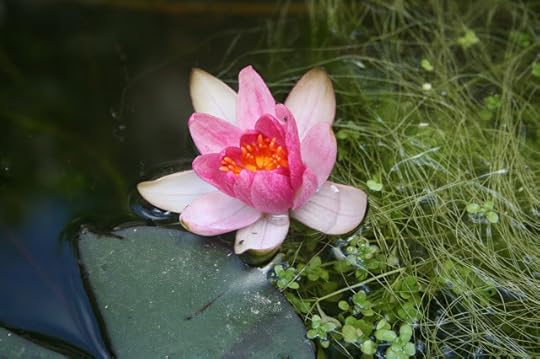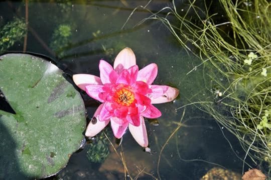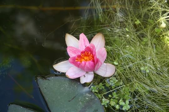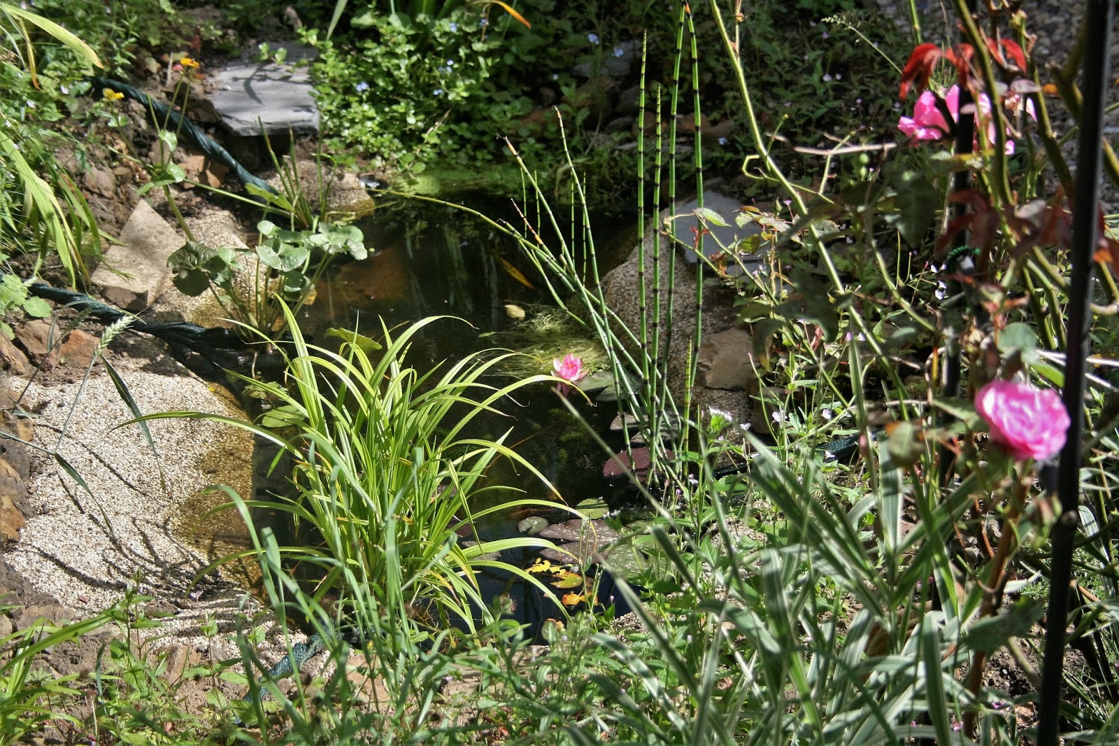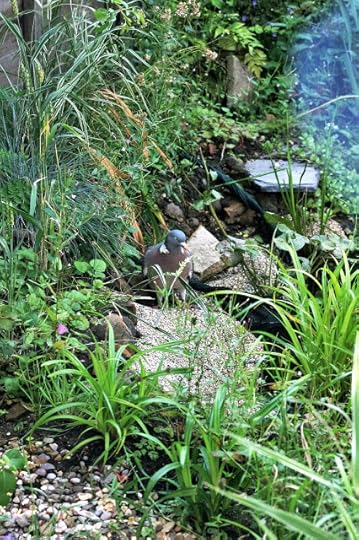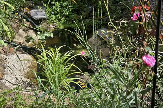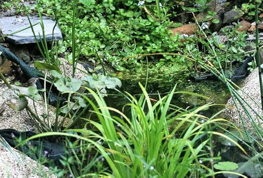 The pond continues to be a joy. Waterboatmen scull across it, hoverflies touch down on the lily-pads, spiders trot over the surface. (They have hydrophobic feet, I have learned, much to my surprise.) A large family of sparrows visits daily, to take communual baths and to drink.