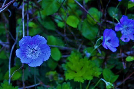 It's a hawksbill geranium and I love its simple, clear shape. Even more, I love its colour which is a deep, rich, slightly purple blue. But in every photo I've taken, with three different cameras, it looks almost white. To get it to look blue, above, I've had to fiddle with colour balance and contrast, and it doesn't do this beautiful flower justice at all. I can only assure you that, in the petal, it's a very pure and beautiful blue, deeper than sky-blue but nowhere near plum. It delights me every time I see it and I'm sorry that I can't share it here.