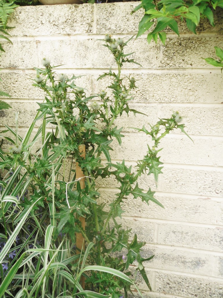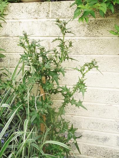 I'm very fond of this brute - 'Touch Me Not With Impunity' and it tells no lies. I was given this by my auntie, who had put on gauntlets and potted it up for me. It spent the winter lying flat in its pot. Then, one spring day, I noticed that all its spiky leaves had lifted themselves up and were pointing at the sky. So I put on armour and planted it against this wall. Since then, I swear it has grown an inch a week and, when the weather warmed up, a inch a day. It is now as tall as I am and you cannot get near it. In Flann O'Brien's The Third Policeman there is a lance with a point so sharp that its end is invisible and it stabs you while you think it is still inches away. Old Touch Me Not is like that. Its flower buds look soft and velvety but touch one and you leap back across the path with your spiked fingers in your mouth. - But we hope that the seeds will attract more birds.