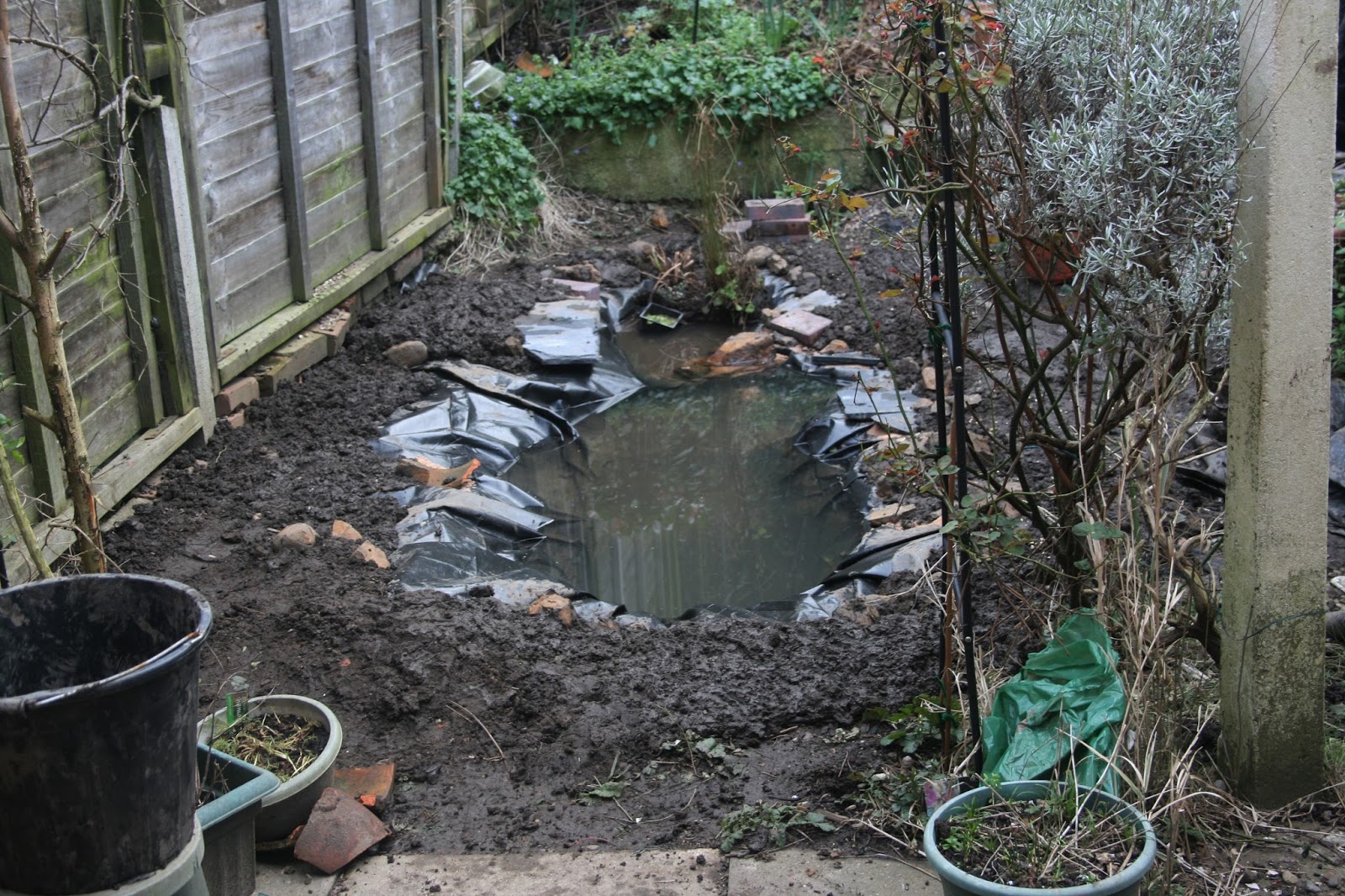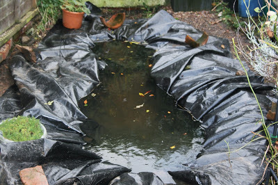 Just to make it even more unattractive, we added a black plastic liner. I can't remember if this was the original which sprang a leak after a couple of weeks, or the later one which is still bravely holding water. We weighted the liner down with pots and bricks, to prevent it thrashing about in the frequent gales. In the picture above, it's frozen solid.