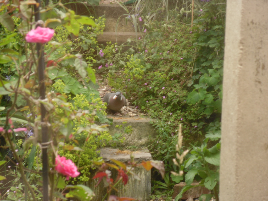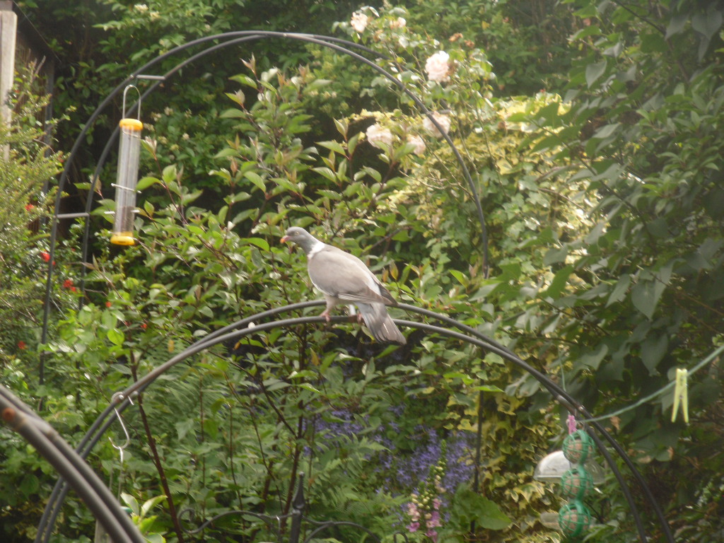 There is always a wood pigeon. Whatever kind of food is put out, Woodie is in there first. Here he is yearning after the niger seed which isn't intended for him. But we also have a little family of dunnocks, a wren, a robin, blackbirds, bluetits, great tits, starlings and house-sparrows.