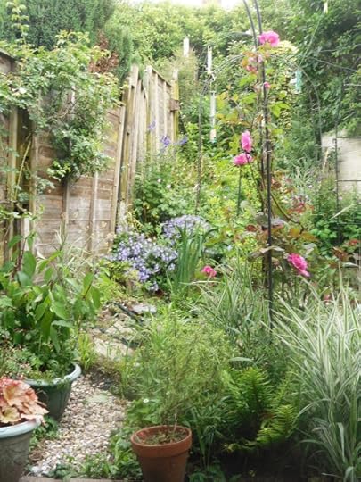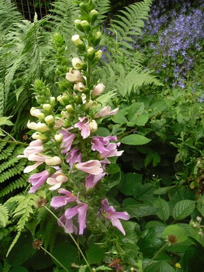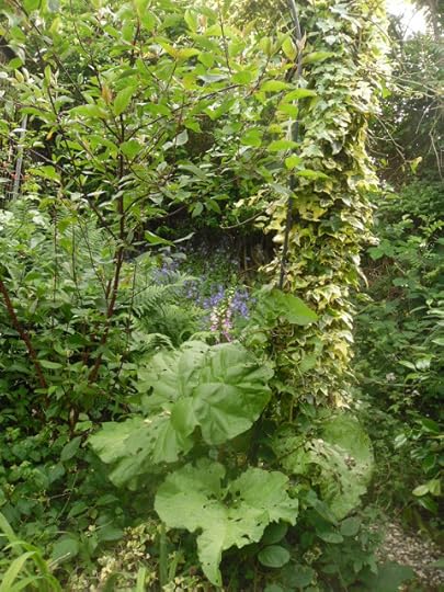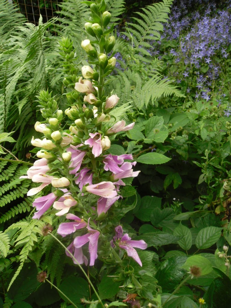 This is the 'wood' at the top of my garden. There is a dogwood, a crab apple, some towering ferns and lots of brambles. And foxgloves.
