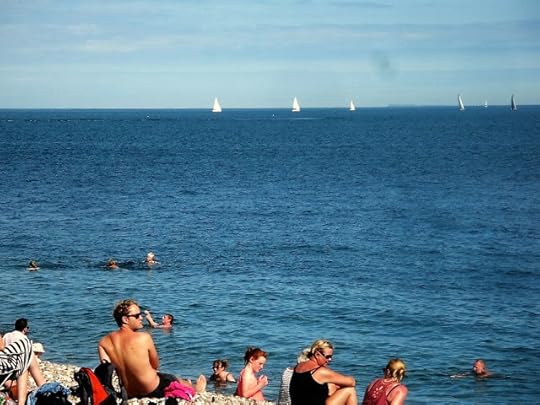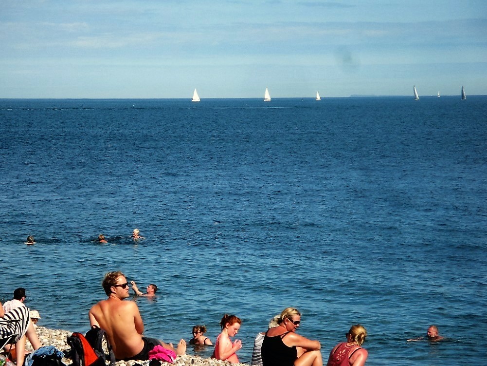 People swam, lay on the hot pebbles and watched the little white sail-boats glide past.