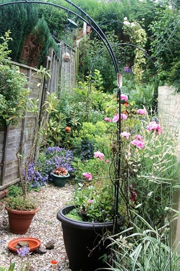 Just below the white roses on the arch at the top of the garden, you can just glimpse the pink of the foxglove I planted in my 'wood.' It's the tiniest of woods, but there are trees, ferns, mushrooms (in season) rotting logs, violets, brambles - and now foxgloves.