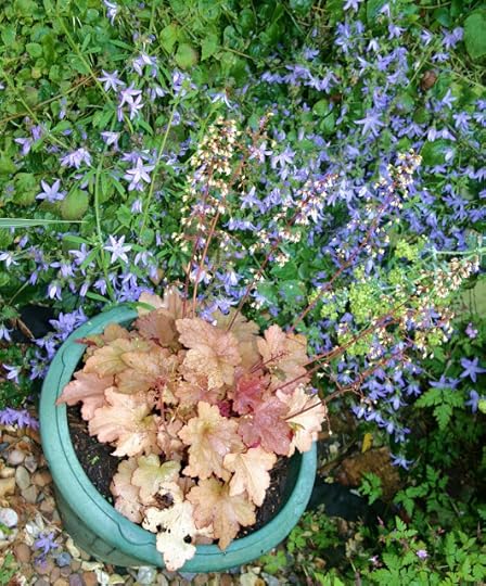 Beyond that, a caramel heuch-something in a pot, set against blue campanula. Above them is an orange dahlia. To the dahlia's right is a plant called, I think, moly-somethingorother, which I love and encourage because its leaves hold the raindrops so beautifully. In fact, I think of it as 'the raindrop plant.'