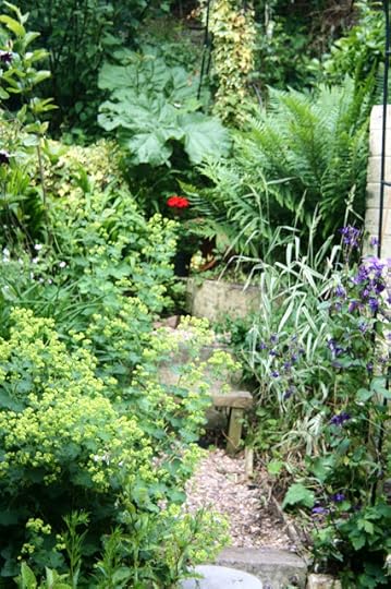 Looking up the slope of the garden... To the right, the dark blue, old fashioned columbines that my grandfather grew - ferns, ivy, a rhubarb plant and a bright red flower which my mother taught me to call a 'pelargonium', not a geranium. (There are pale pink hawksbill geraniums just to the left of the pelargonium.)