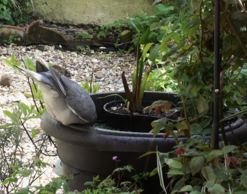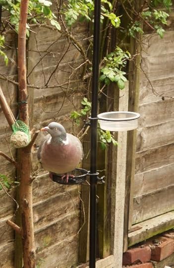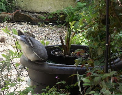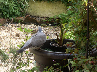 The cunning plot was that by attracting more insects, we would attract more birds. Well, we've had a few fleeting visits from great tits, blue tits, sparrows and starlings - but mostly it's been the wood pigeons. They caught on fast to the fact that we put out peanuts, and now they loiter with intent, on the fence and in the hedge.