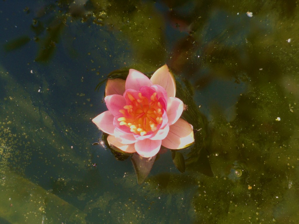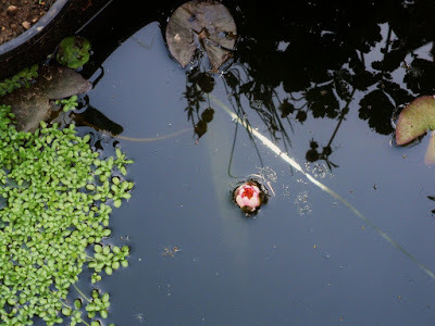 I was thrilled, one morning, to see that the water-lily had sent up a bud, which was just under the surface. You can see it at the centre of the picture below.