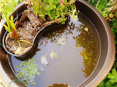 A pond also needs margin plants, to shelter and attract insects, and a bank for birds to land - and also to provide a way out for creatures that fall in. It's hard to provide that in a deep pot, so I slung a basket of marginal plants from the side.