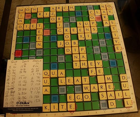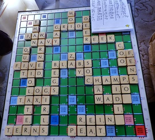 Davy is nearly always the winner, by hundreds of points, because he has a mathematical mind and doesn't care what the words mean, so long as they're allowed and score highly. (Though he is always grumbling that the strange words defined in the dictionary as 'Scots usage' are news to him. Words like 'ee' and 'em.' That's the whole word - em. I think it means 'uncle.')