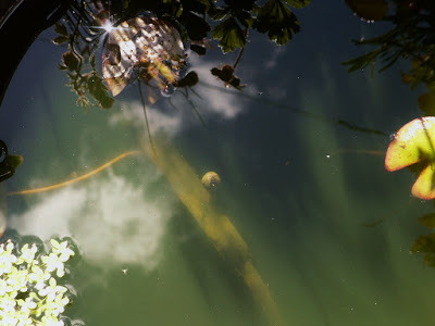 The pond in a pot's been in place for a month now. The plants seem settled and happy. It's certainly attracting more insects of all kinds - bees, hoverflies, lace-wings, bluebottles, and just unidentified wingy-things.