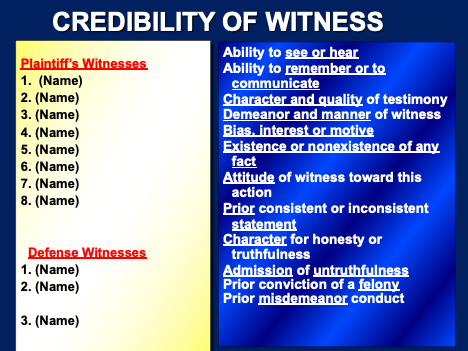 Here is a chart that you could adapt to your case as a visual aid to discuss the credibility of the witnesses. In the left column are the parties witnesses names and on the right the factors stated in the court’s jury instructions that the jury may consider in determining the credibility of the witnesses.
