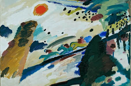 Expressionism is another matter: the synchrony is amazing. I am thinking of 1910: the year of Wassily Kandinsky’s first non-representational painting. Non-tonal music was simultaneously conceived by Arnold Schoenberg and with the same goal: capturing instinct at the cusp. What is more, Kandinsky and Schoenberg recognized their kinship. And they corresponded about it: an imperishable sequence of letters. (Schoenberg singled out Kandinsky’s “Romantic Landscape” [1911], reproduced above, as a personal favorite.)