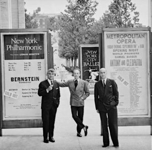 The starting point of my essay is an iconic 1966 photograph I remember from my teenage years. Balanchine, Bernstein, and Rudolf Bing, general manager of the Metropolitan Opera, are posed in front of Lincoln Center’s Philharmonic Hall. The Met is about to inaugurate its new home, completing the move to Lincoln Center of the three main institutional constituents. Bing stands alongside a poster brandishing the sold-out world premiere of Samuel Barber’s Antony and Cleopatra, inaugurating the New Met. Bernstein (with cigarette) stands alongside a poster showing the sold-out run of a subscription program comprising an obscure Beethoven overture, William Schuman’s String Symphony, and Mahler’s First (not yet a repertoire staple). A City Ballet poster, to the rear, announces the dates of the Fall season. So depicted, three performing arts leaders – all of them famously strong personalities — are seen poised to drive their celebrated companies to greater heights, buoying an unprecedented American cultural complex