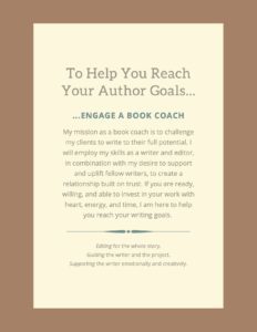 Book coaching is a bit like developmental editing. It’s reading and working with a client on a manuscript from start to finish, and helping that client reach their personal goal for their work.