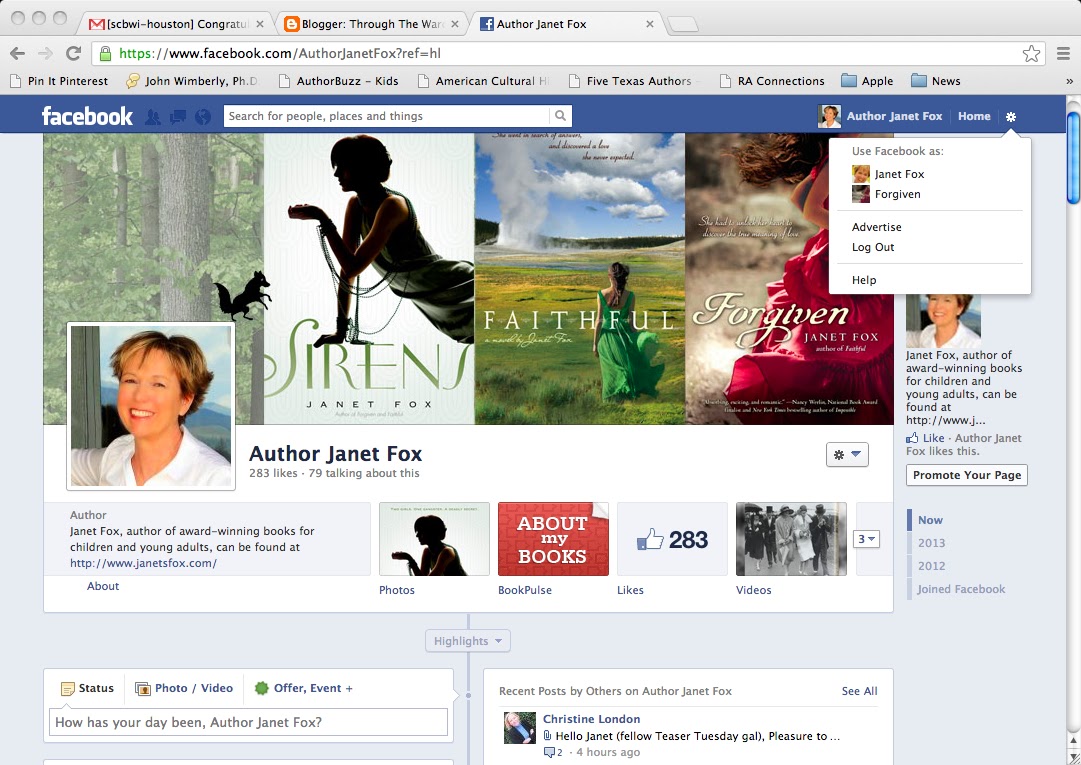 Are you with me? On the screen shot above you can see that I've selected the flywheel and what drops down allows me to toggle back and forth between my author page and my personal profile. (You'll also see that at one time I created a FORGIVEN page, but I find that I have enough to manage between personal and professional, and that FORGIVEN page lies mostly idle.) You can also maybe make out that my little profile pic is different. Now I know which page I'm working from as I scan Facebook because these pics are different from personal to professional. Believe me, it's not always obvious, which you will see as you play with this.