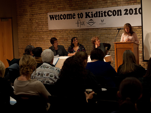 Then to KidlitCon - the Kidlitosphere Conference in Minneapolis, hosted by a gracious triumvirate of Andrew Karre of Carolrhoda, Ben Barnhart of Milkweek Press, and Brian Farrey of Flux, and which brought friendly bloggers from across the "sphere"(I had such fun getting to know the people behind the blog names!) The amazing Swati Avasthi (SPLIT), who lives in Minneapolis, offered to help set up signings and a panel and..voila! I was there with Swati, Michele Corriel (FAIRVIEW FELINES) and Jacqueline Houtman (THE REINVENTION OF EDISON THOMAS), all of us from Class of 2k10 (left to right, Jacqueline, Swathi, me and Michele; photo by Andrew Karre.) And boy, was that a learning curve, the result of which (as I hope you'll see) I'll be REINVENTING THE BLOG OF JANET FOX. Rather than try and describe the conference, suffice to say that I learned one major lesson: