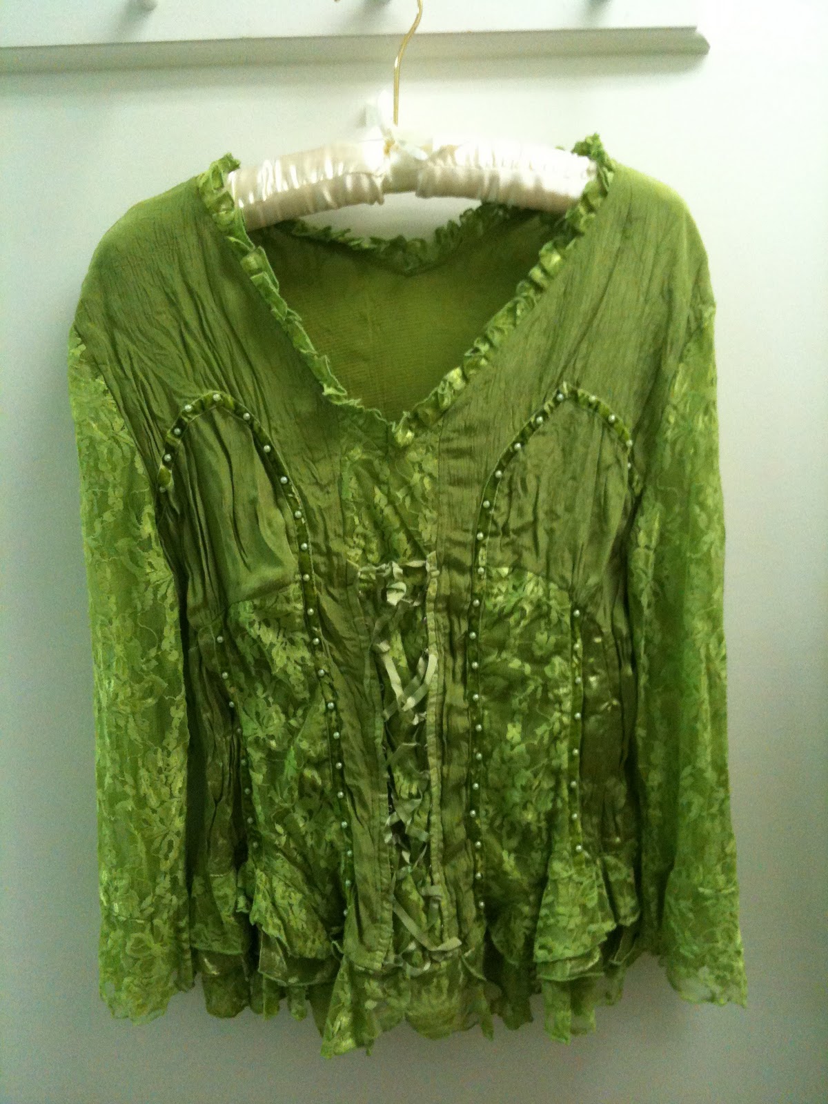 Oh, yes, we did have fun! Meals, a movie (primed for discussion about repetition), and after a wonderful walk with Darcy I even had time to do a little roaming around town and found a green top that looks so much like Maggie's dress in Faithful ...I can't wait to find a skirt and wear it. (See? There's actual lacing in it! Fun!)