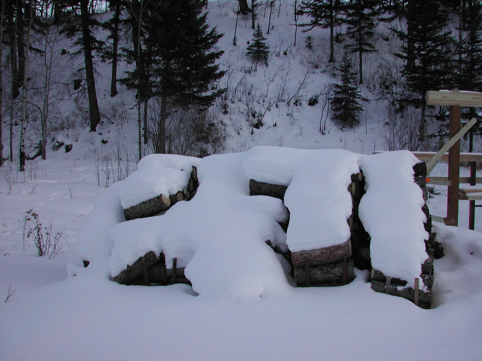 We're now living in a small but cozy cabin in the Montana mountains and we do burn wood, mostly for pleasure, in the fireplace, and my industrious husband spent a number of weeks gathering what I thought was an extravagant amount of wood for this winter. Here's what the pile looked like in October.