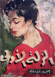 I love Egyptian paperbacks. Even classics by Naguib Mahfouz and Taha Hussein get this romantic, film-poster treatment. Most have a woman in the foreground and a handsome chap or two (often in cool colors, and often wielding a weapon) in the background. Some are quite risque. The interiors often contain excellent black-and-white line drawings or prints.